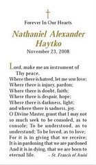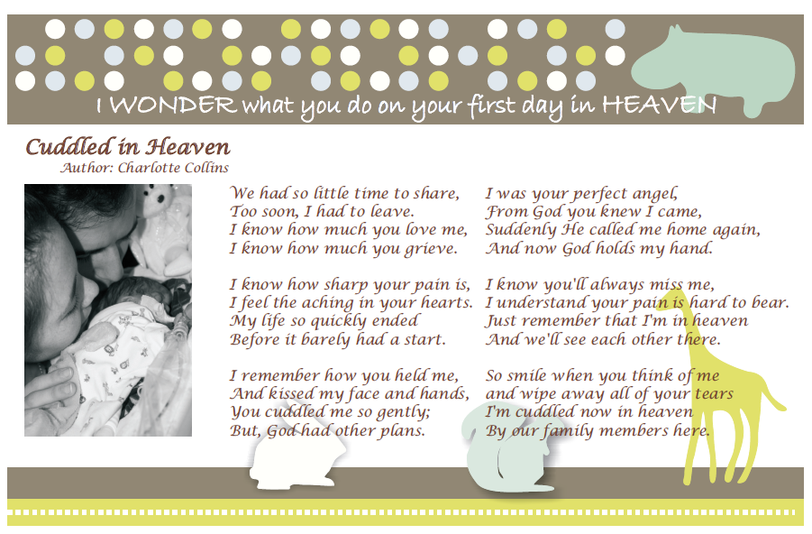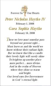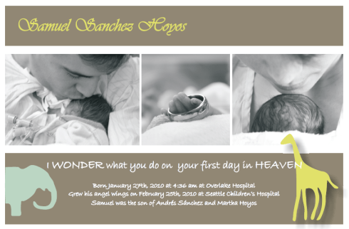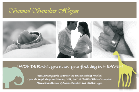 For those having trouble finding a photo/memorial announcement for their child, particularly on short notice, I thought I would offer an idea. I spent 5 hours yesterday trying frantically to find a meaningful, fitting photo card that would not only serve well as a memorial card, but arrive in time for my son’s service. I ended up going with tinyprints.com. They have a section for baptism/christening that has some photo announcements that are “generic”, so you can add or change the text. Most of the “birth announcements” end up with phrases like “welcome” or “it’s a boy!”, that could not be altered and it was very discouraging as I thought I would never find a nice Christian baby template that I could use. They also offer expedited processing and shipping so that you can get the order in as fast as 2 days. Just wanted to give a heads up in case other grieving parents stumble across this page, as I did, in their search to plan for the loss of a child.. God Bless.